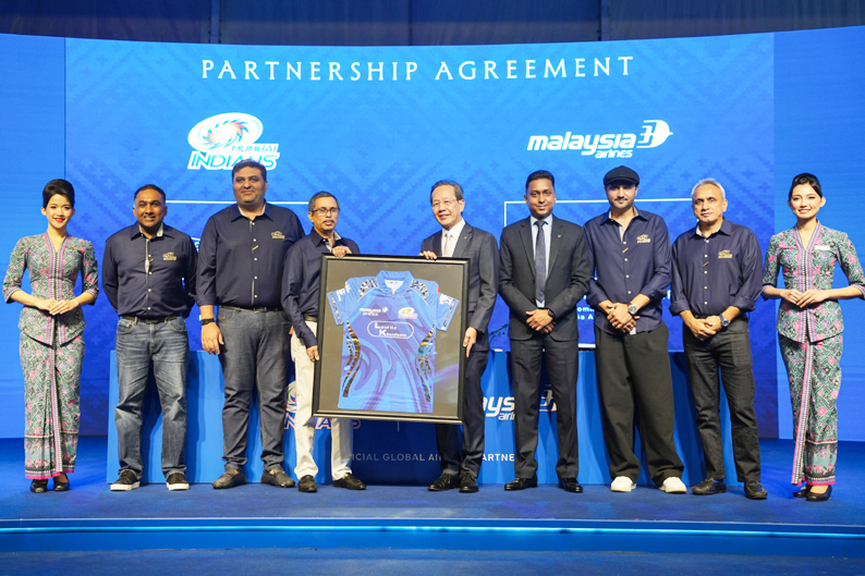 In frame: Malaysia Airlines Cabin Crew – Mr. Mahela Jayawardene, Head Coach, Mumbai Indians – Mr. Devang Bhimjyani Head, Reliance Sports and Lifestyle (RISE) – Mr. B Srinivasan, President & Chief of Staff, Reliance Industries Limited (RIL), – Datuk Captain Izham Ismail, Group Managing Director, Malaysia Aviation Group- Mr. Dersenish Aresandiran, Chief Commercial Officer, Malaysia Aviation Group, – Mr Harbhajan Singh Mumbai Indians Legend and Mr. Rahul Sanghvi, Director of Cricket, Mumbai Indians.
